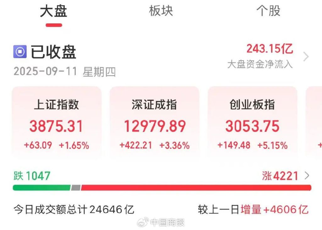 中国商报(记者 王彤旭)9月11日,A股三大指数集体大涨。截至收盘,沪指涨1.65%,深证成指涨3.36%,创业板指涨5.15%,北证50涨1.59%。沪深京三市全天成交额为24646亿元,较上一日放量4606亿元。全市场超4200只个股上涨。