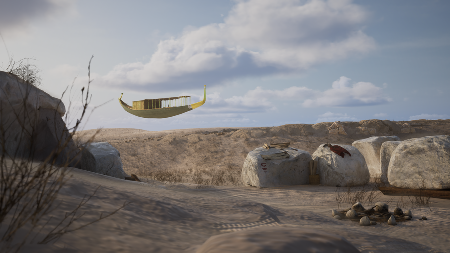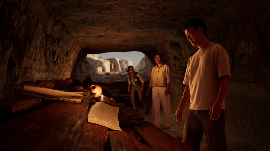 很多时候,俯下身子能带来意想不到的视角。比如在图拉采石场的狭长石洞里,能看到许多小蚂蚁在陶罐下爬行。在红海古港瓦迪·贾尔夫岸边铺开的一份莎草纸是考古发现中的关键文献——梅勒日记,上面每个古埃及象形文字都清晰可辨。有虚拟世界的掩护,观众可以正大光明地凑上去“偷看”这份秘密文档,它详细记载了石料运输与工程组织方式。