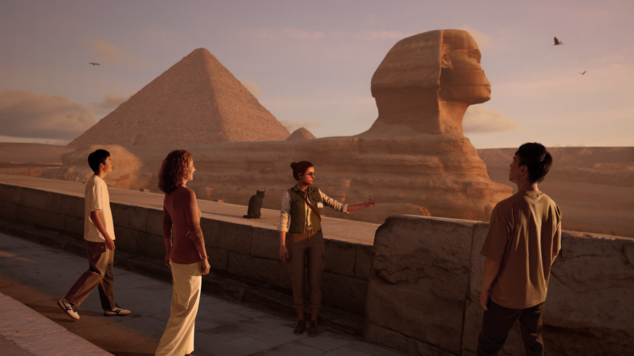 从《消失的法老》到《建造者之谜》,这部VR领域的IP续作能否保持原汁原味?记者戴上头显,熟悉的画面与感觉瞬间回归。跟随埃及导游莫娜的步伐饱览雄浑壮阔的沙漠美景,进入雄伟壮观的古金字塔探秘参观,乘坐飞艇穿梭时空寻找谜题答案……第一部中的核心人物、亮点环节在第二部中均有回归,剧情结构、互动方式和前作一脉相承,那只以奇妙魔法让观众“穿墙”窥探的黑猫巴斯特也再次现身,带领大家回到4500年前的古埃及,观看胡夫法老的父亲与爷爷时代金字塔的建造工艺。整部作品时长45分钟,每一分钟都信息量巨大。