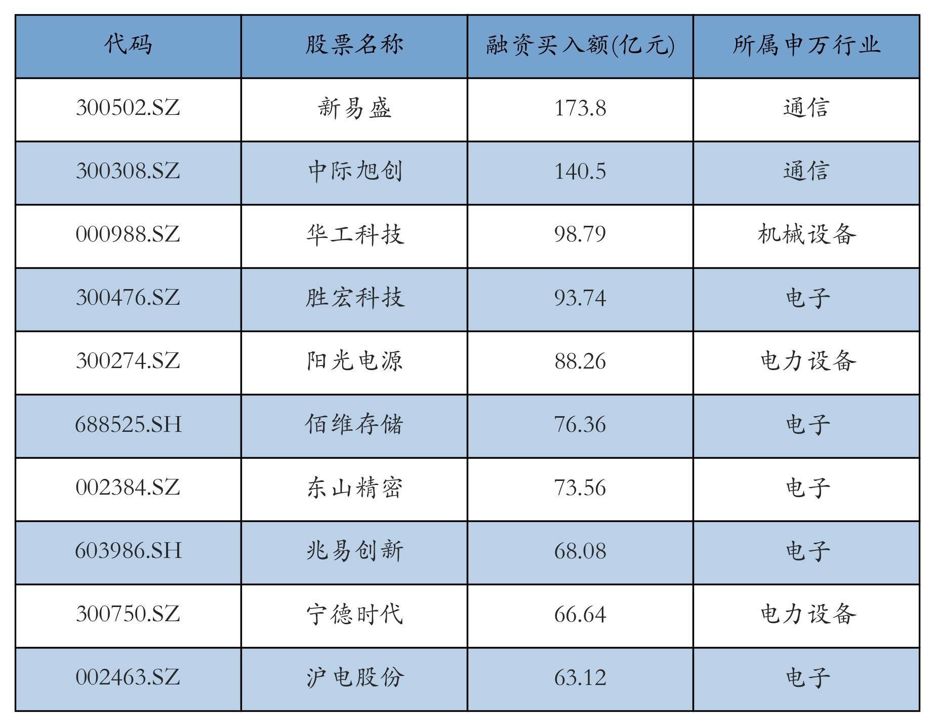 上周两市共有3489只个股有融资资金买入,共有168只个股买入金额超10亿元,其中新易盛、中际旭创、华工科技排名前三,买入金额分别173.8亿元、140.5亿元、98.79亿元。融资买入额前10个股详情见下表: